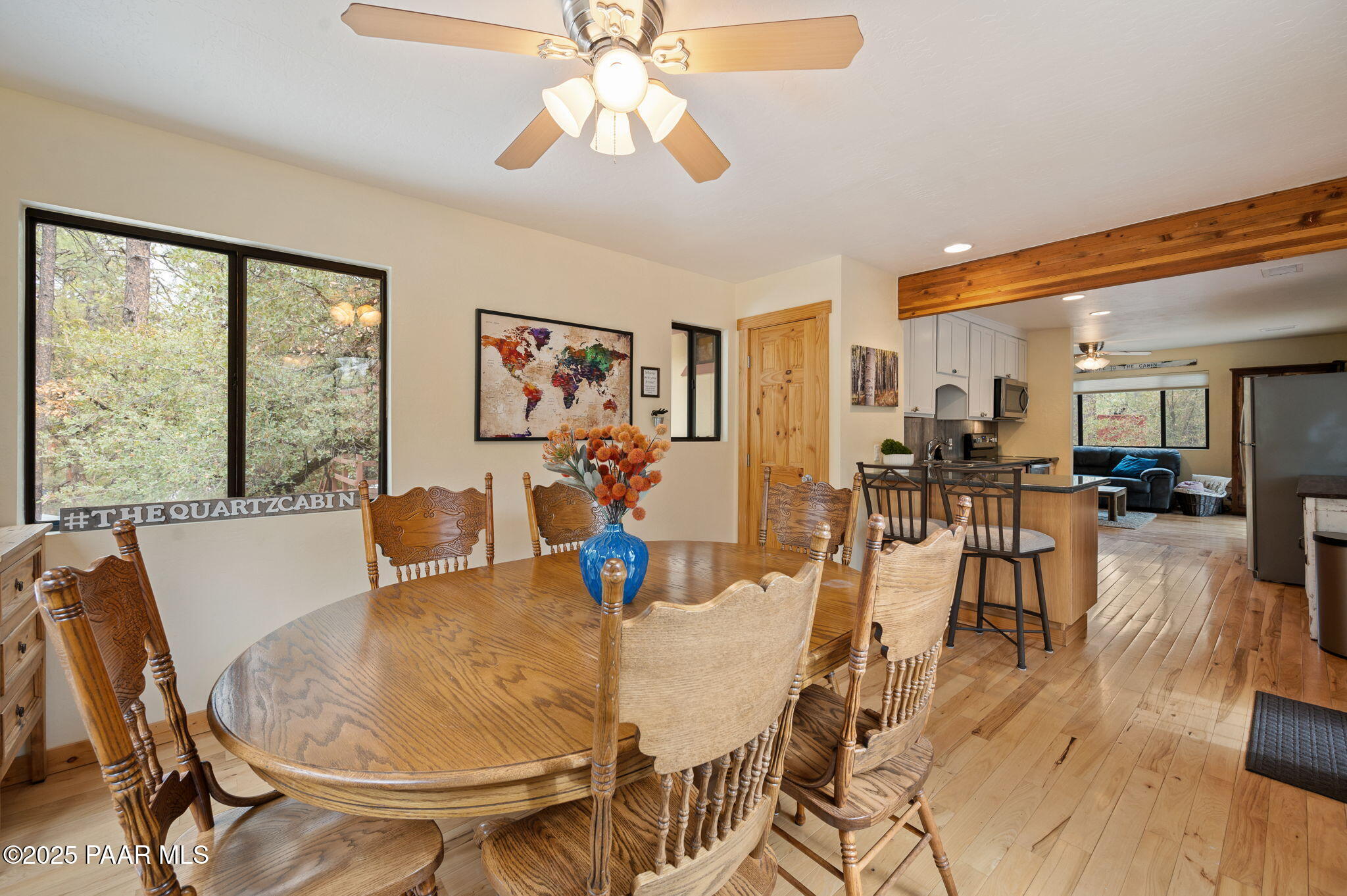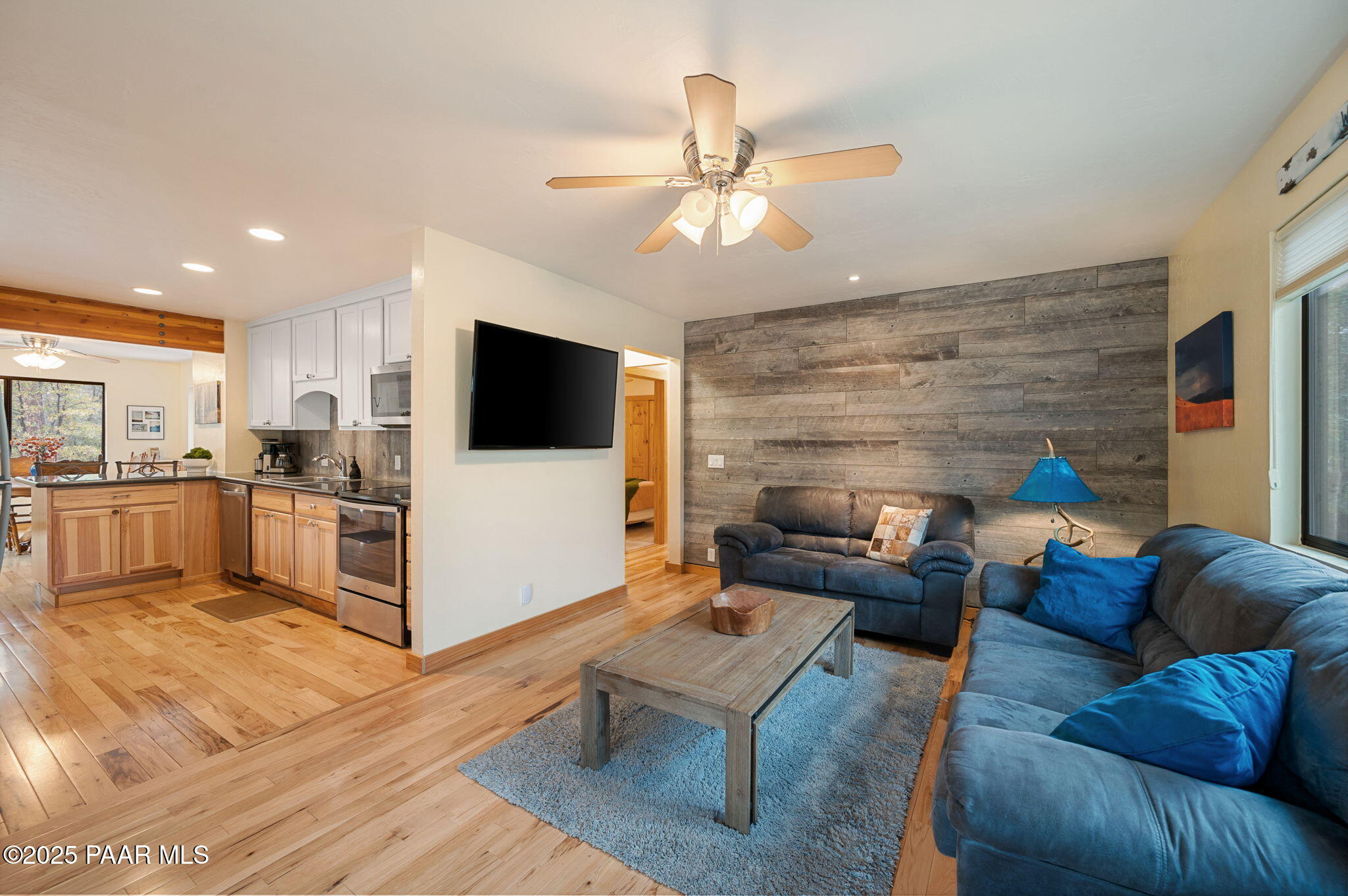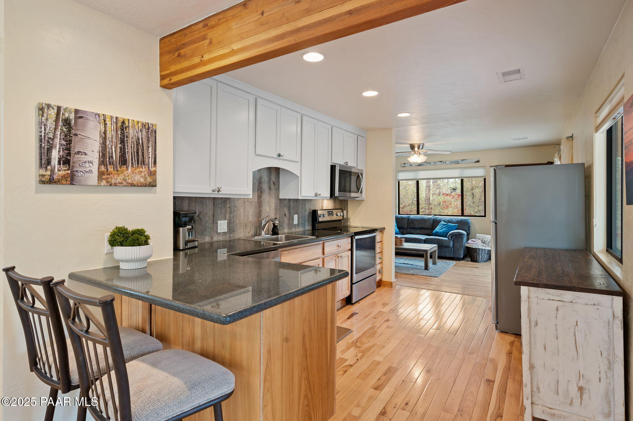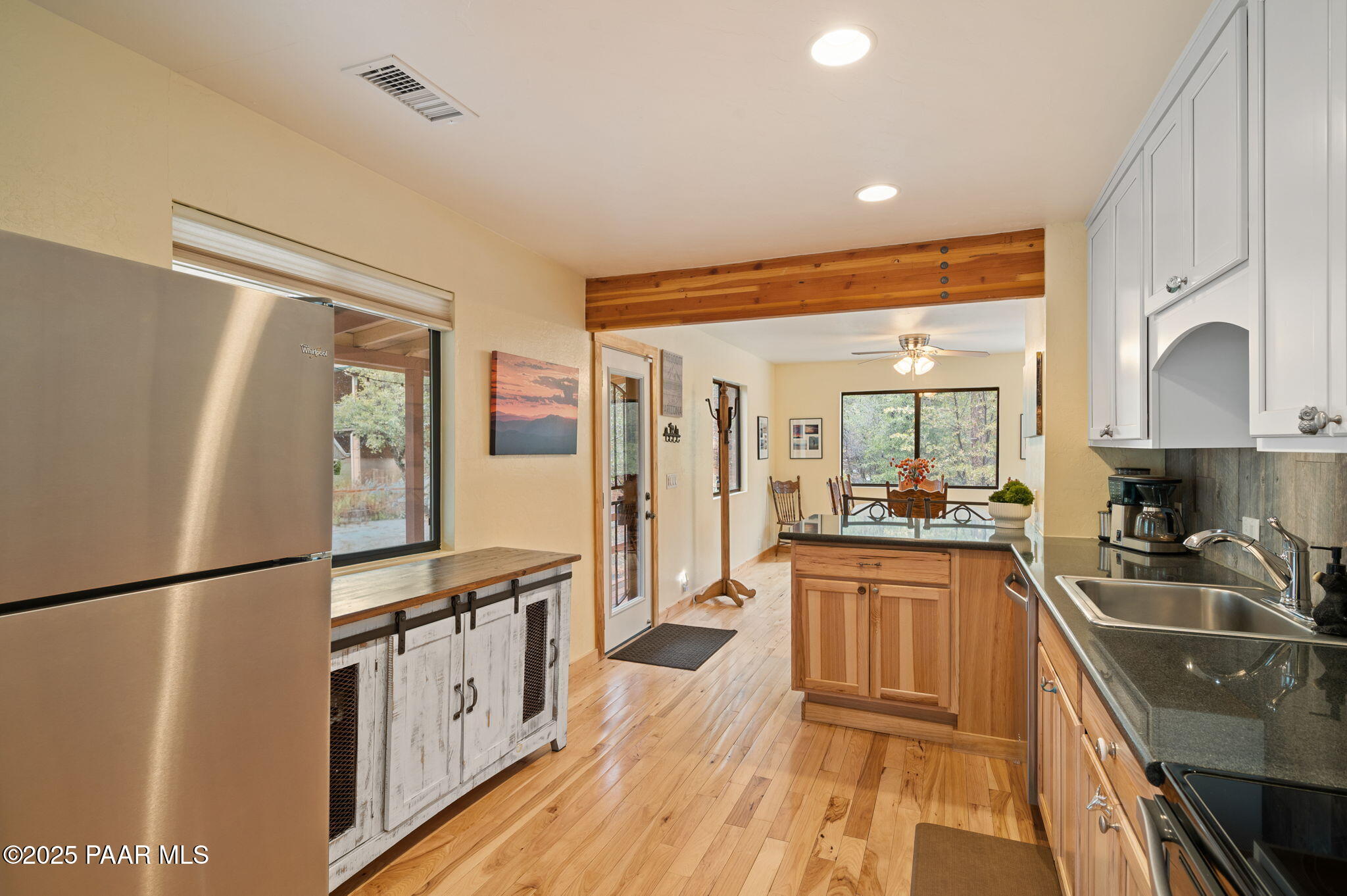 Escape to the pines with this beautifully remodeled 3-bedroom, 2-bathroom fully furnished cottage. Nestled in a tranquil location, you can step outside your front door and enjoy leisurely walks through the National Forest. Enjoy your outdoor activities with peace of mind with a Central Yavapai Fire Station located within this beautiful community!This cozy home boasts a custom kitchen with stunning wood tile and hickory floors, offering the perfect blend of rustic charm and modern conveniences. The spacious living areas provides ample room to relax and unwind, while the one-car garage--an uncommon find in this area--adds extra value, along with a detached storage building for all your needs. Whether you're searching for a vacation getaway, a full-time residence, or a rental property ,this home is ideal for all!. Located just 5.5 miles from Courthouse Square, you'll have quick access to shopping, dining, and local attractions, all without no hassle of an HOA. Recent upgrades include a brand-new hybrid water heater and a new main water line from the house to the street, ensuring efficiency and comfort. If you're looking for a peaceful retreat in the cool pines, this is the one you've been waiting for!